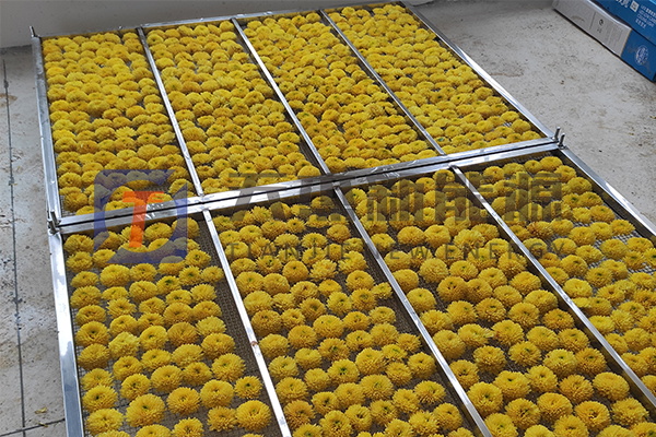 裝房過(guò)程中:將采摘好的菊花進(jìn)行挑揀,選擇花型一致,顏色統(tǒng)一的鮮菊花,均勻擺放在托盤上,如果對(duì)花型有要求嚴(yán)格的話,則建議在擺放時(shí)不要重疊,隨后放置在推車上,推進(jìn)菊花烘干機(jī)內(nèi)。