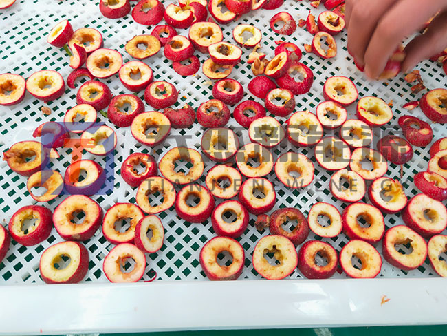 二、接下來就是進行護色處理,一般多用0.5%異維生素C溶液浸泡10-15分鐘,防止果片變色并盡快瀝干水分,均勻的將山楂片平鋪向托盤中,隨后放進烘干機里。