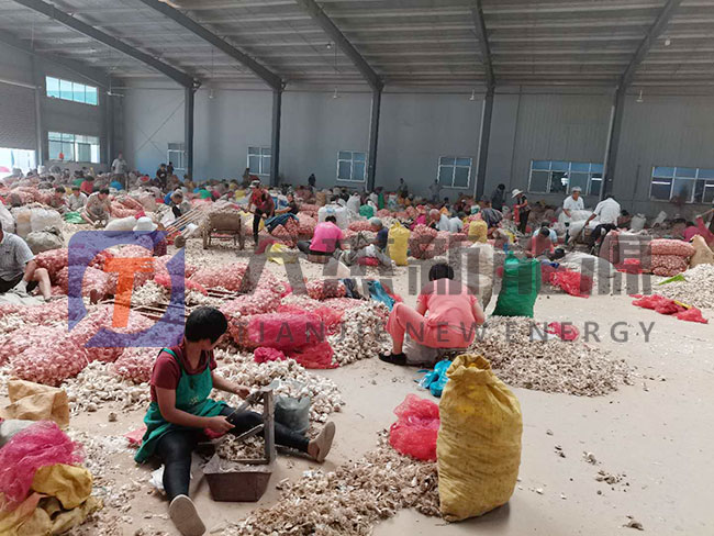 二、分瓣后,蒜瓣和外表皮是混合在一起的,那么如何把它們分開呢,用鼓風(fēng)機(jī)產(chǎn)生的強(qiáng)大風(fēng)力。因?yàn)樗獍甑谋戎乇人馄ご?,也就是說蒜瓣重,外表皮輕,用風(fēng)力可將蒜皮除去。沒有除去的蒜皮還要人工挑出。