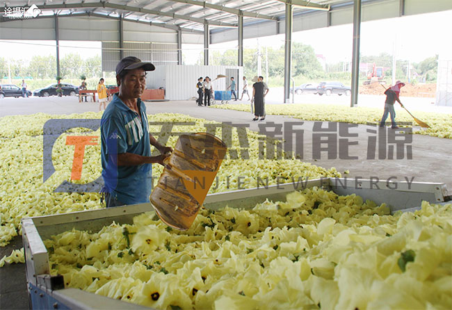 黃蜀葵采摘后,前期挑選處理完裝入黃蜀葵烘干設(shè)備的烘干托盤里,開(kāi)放的不同程度的黃蜀葵建議分開(kāi)放置,為保證原有顏色,花苞與花朵建議分批次烘干。然后將物料盤放進(jìn)物料車,一般14P的黃蜀葵烘干機(jī)可以放入物料車8臺(tái),每臺(tái)裝150斤鮮物料。
