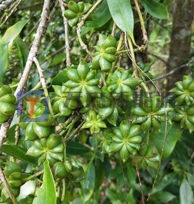 八角果實(shí)成熟時(shí),樹枝上還有花和幼果,所以采果時(shí)不能用竹竿打落果,也不宜搖動(dòng)樹枝和折枝,只能上樹采摘