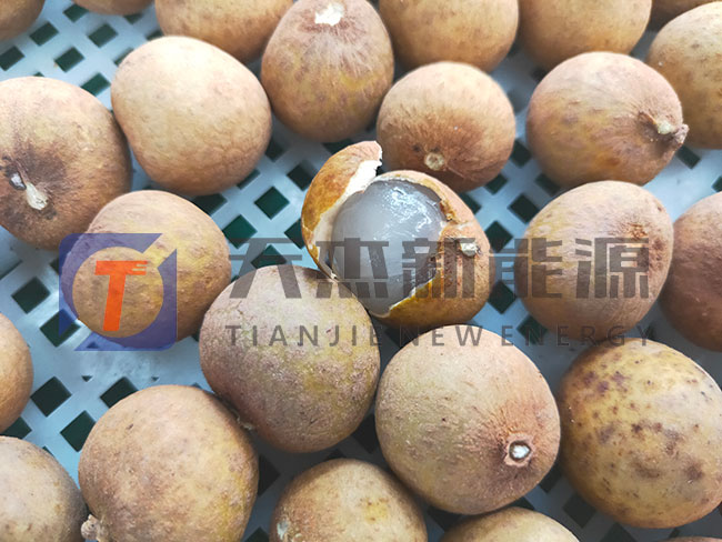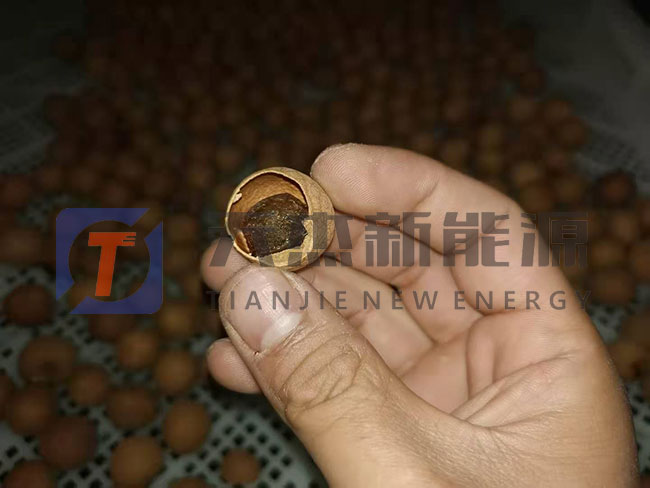 初烘:將龍眼均勻的攤放到龍眼桂圓烘干機推車上,初始溫度設(shè)定為55℃,烘干時間為8個小時左右,初烘完成的成品是外殼堅硬,果肉呈黃褐色或赤褐色并帶油光,有細小皺紋,果核外皮易脫落,核仁淡白色。